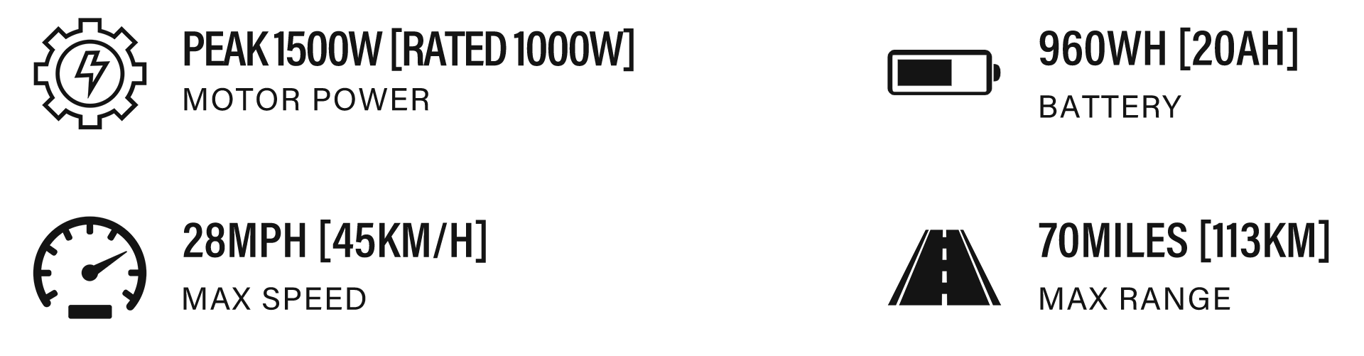 - Motor: Peak 1500W (Rated 1000W) 60Nm Brushless Rear Hub Motor