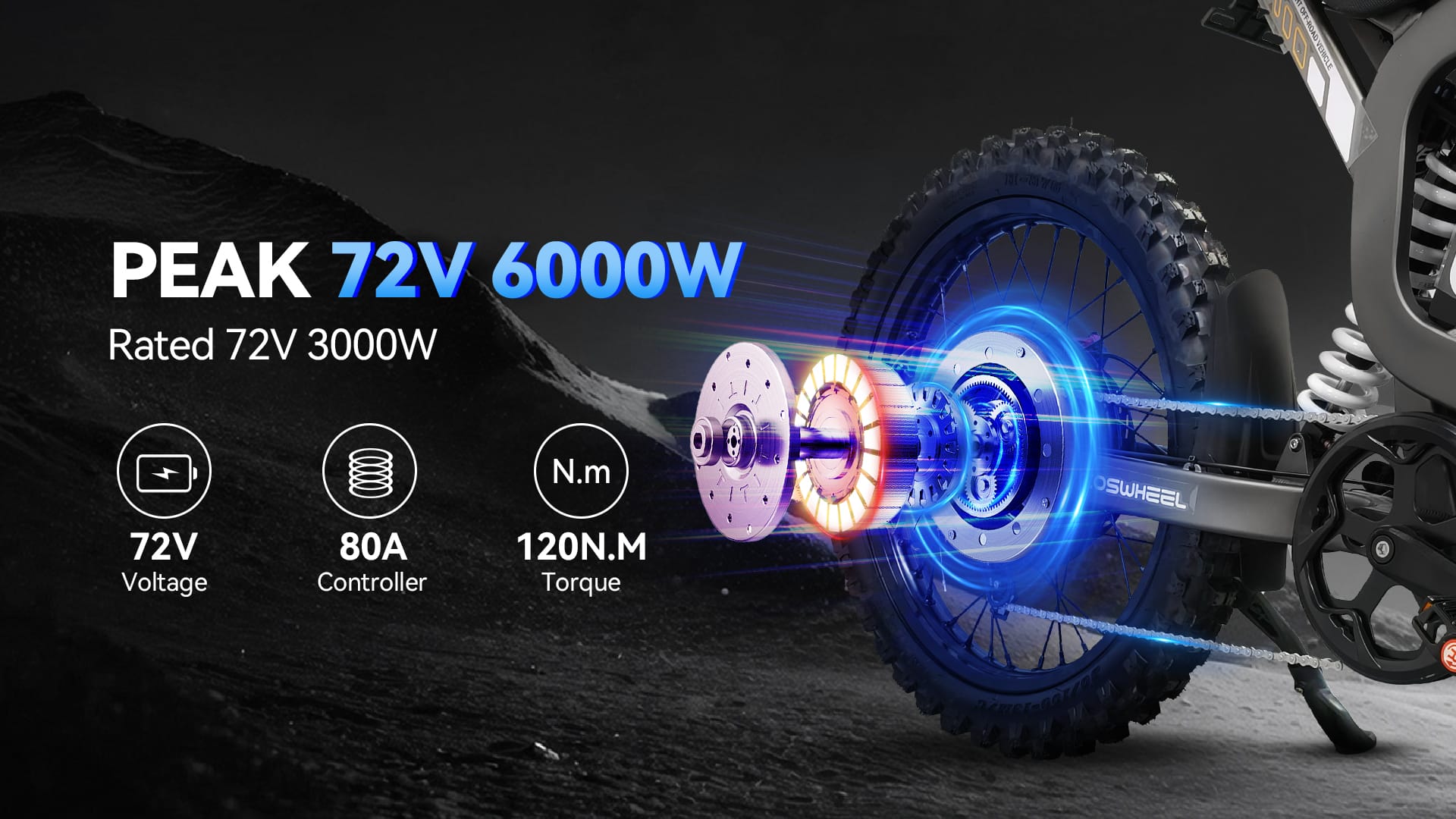 - Motor: 72V Peak 6000W (Rated 3000W) Brushless Rear Hub Motor 120Nm