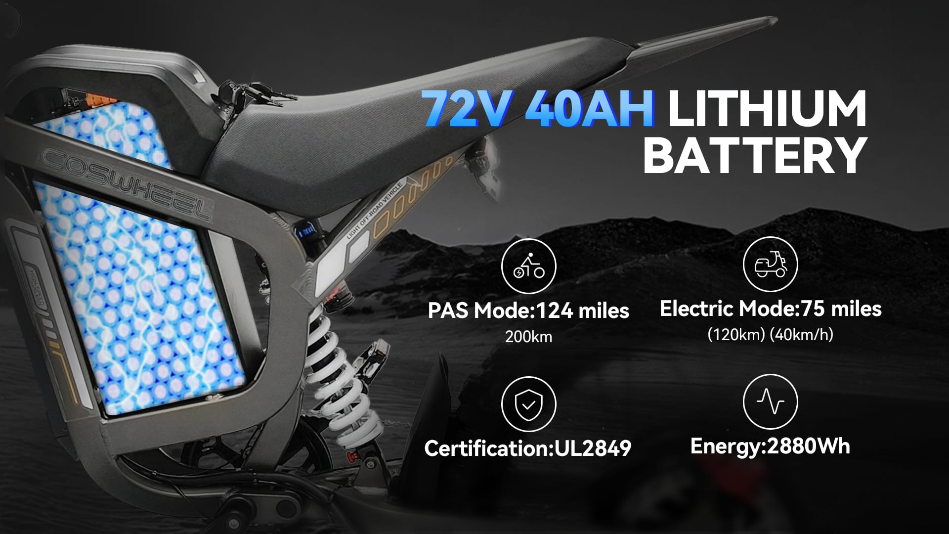 - Range: 75+miles (120km) in Class-2 throttle-only mode (pure electricity); 124miles (200km) in Class-1 PAS (pedal assist)
