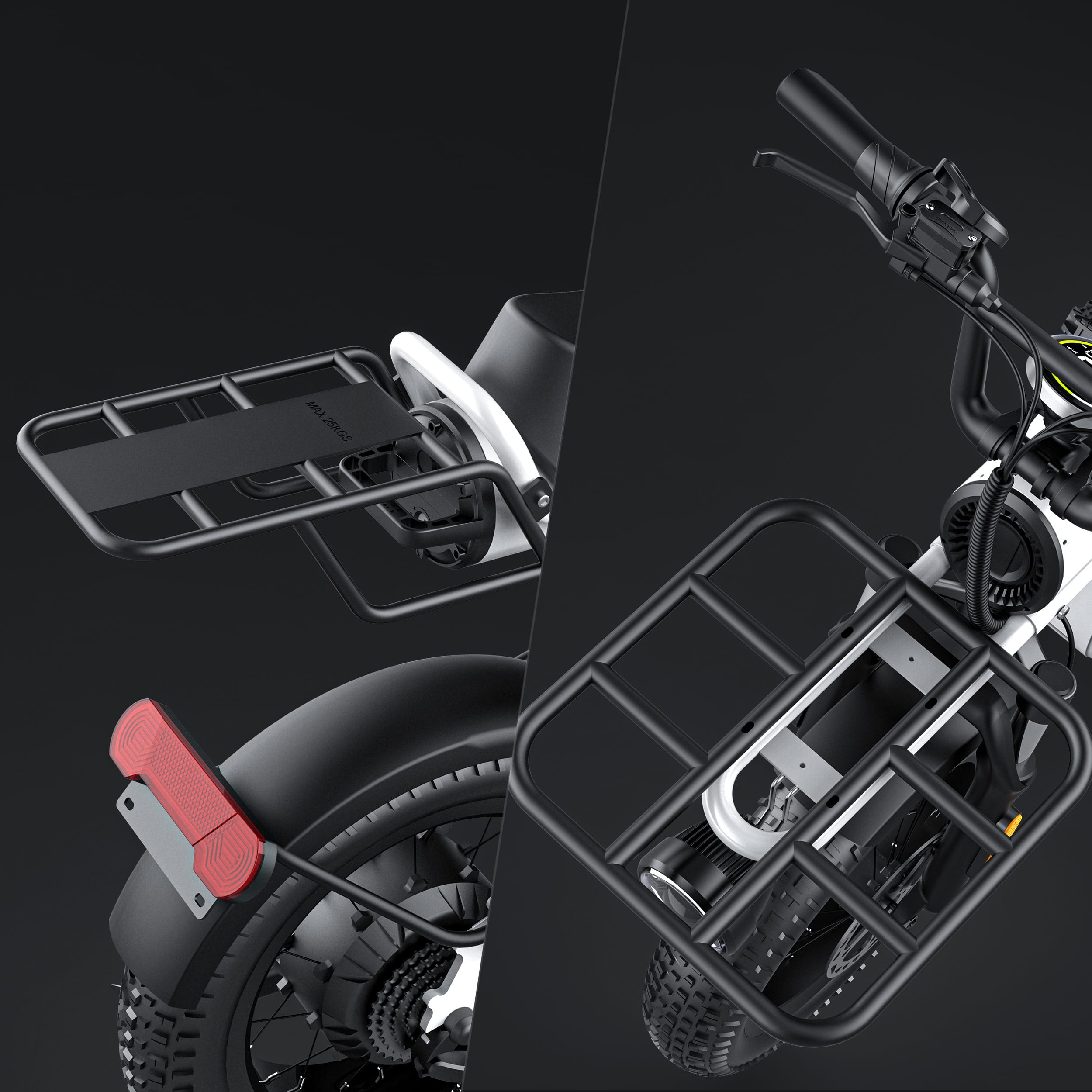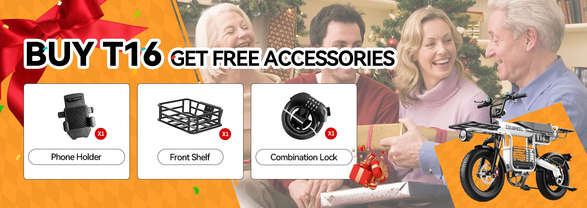 T16 Ebike*1/Fender*2/Charger*1/Manual*1/Tool Bag*1/Rear Shelf*1/Front Shelf*1
