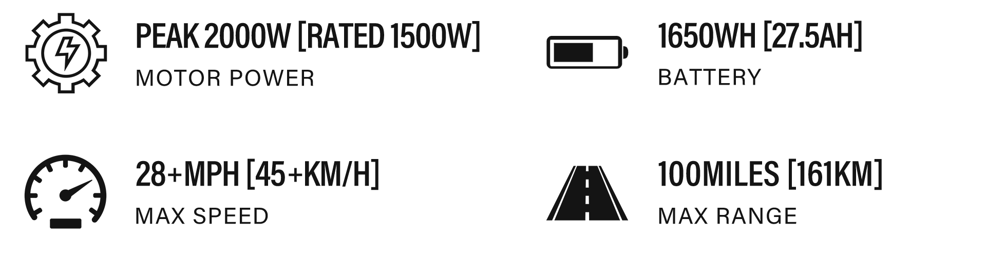 - Range: 55+miles (88km) in Class-2 throttle-only mode (pure electricity); 100+miles (161km) in Class-1 PAS (pedal assist)